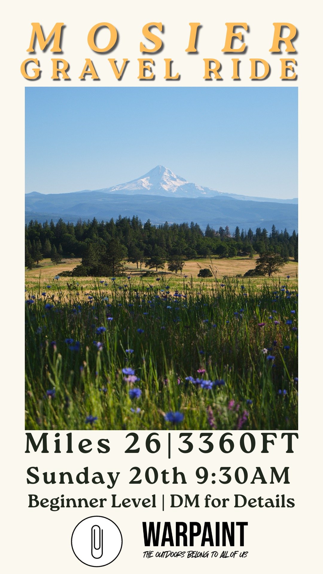 Join us for a mellow gravel ride geared towards beginners that we are doing in collaboration with The Paperclip. Distance is going to be 25.8 miles and the elevation gain will be about 3,300 ft. The route is 43% paved and 57% gravel road. Pace is going to be mellow and there will be rest stops as needed. Would love to have beginners join us and get the experience of an out of the city gravel adventure. We will be out near Mosier, OR. Limited spaces will be available for carpooling. Email us to let us know if you’re interested in joining at info@warpaintoutdoors.org